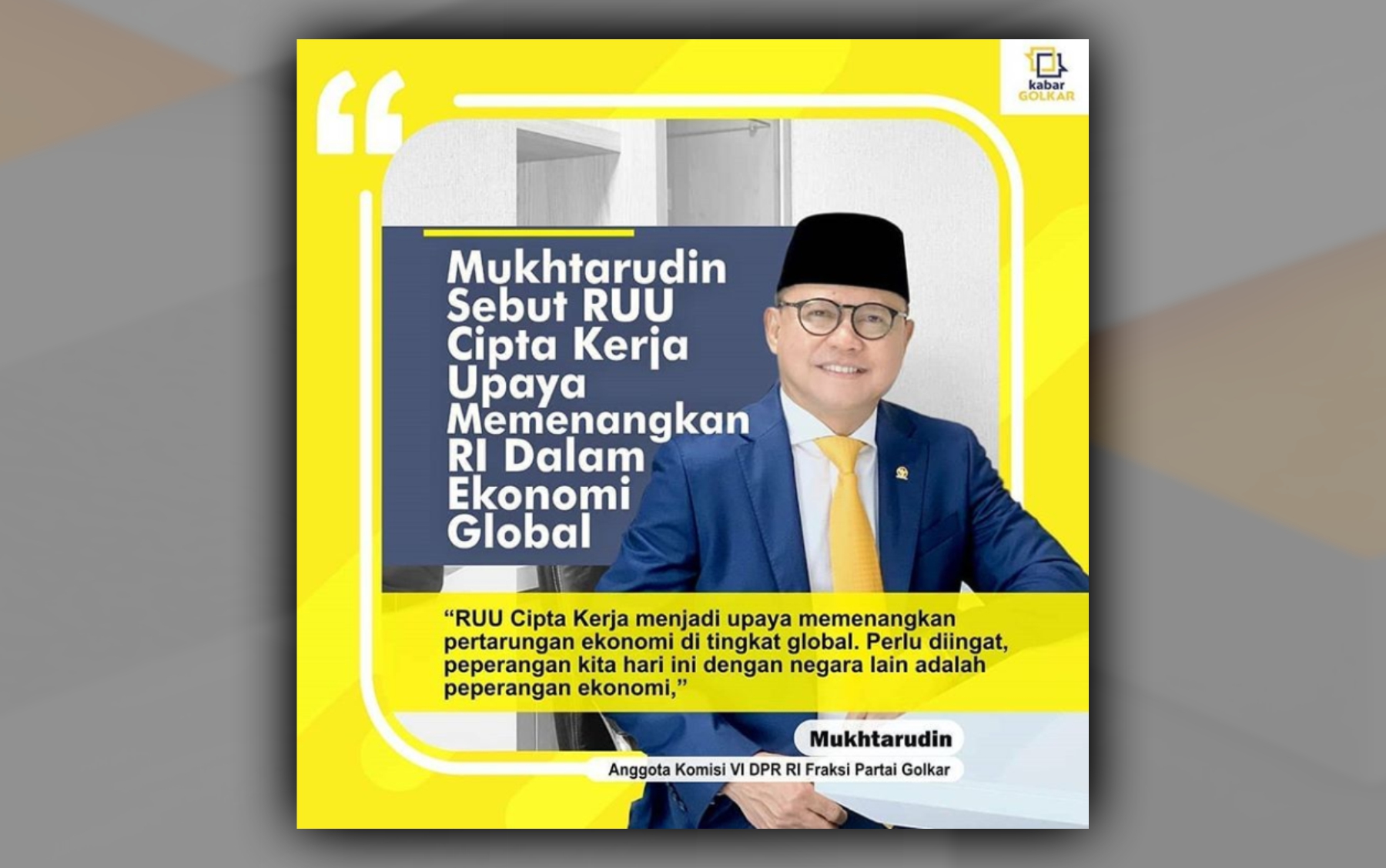 “RUU Omnibus Law menjadi upaya memenangkan pertarungan ekonomi di tingkat global. Perlu diingat, peperangan kita hari ini dengan negara lain adalah peperangan ekonomi,” kata anggota Komisi VI DPR, Mukhtarudin, kepada Koran Jakarta, Minggu (15/3).