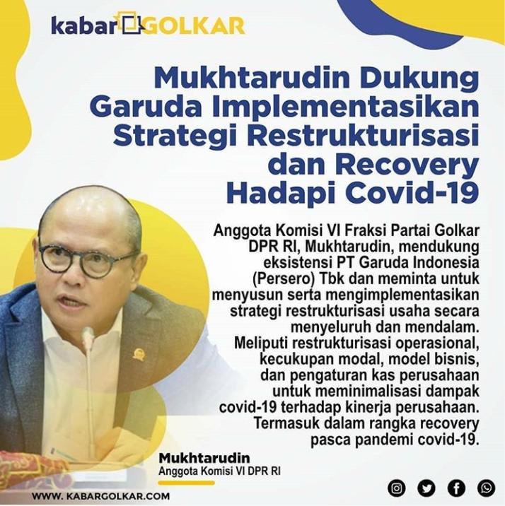 Anggota Komisi VI Fraksi Partai Golkar DPR RI, Mukhtarudin, mendukung eksistensi PT Garuda Indonesia (Persero) Tbk dan meminta untuk menyusun serta mengimplementasikan strategi restrukturisasi usaha secara menyeluruh dan mendalam. Meliputi restrukturisasi operasional, kecukupan modal, model bisnis, dan pengaturan kas perusahaan untuk meminimalisasi dampak covid-19 terhadap kinerja perusahaan. Termasuk dalam rangka recovery pasca pandemi covid-19