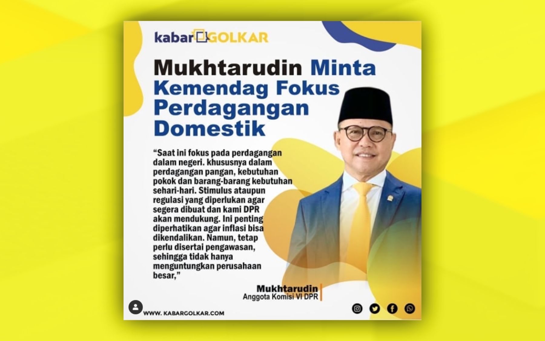 kabargolkar.com, JAKARTA – Anggota Komisi VI DPR Mukhtarudin meminta agar Kementerian Perdagangan memfokuskan perdagangan dalam negeri sehingga mampu meningkatkan peran dari Usaha Mikro Kecil Menengah (UMKM) yang diyakini akan berkontribusi pada perekonomian dalam kondisi saat ini.