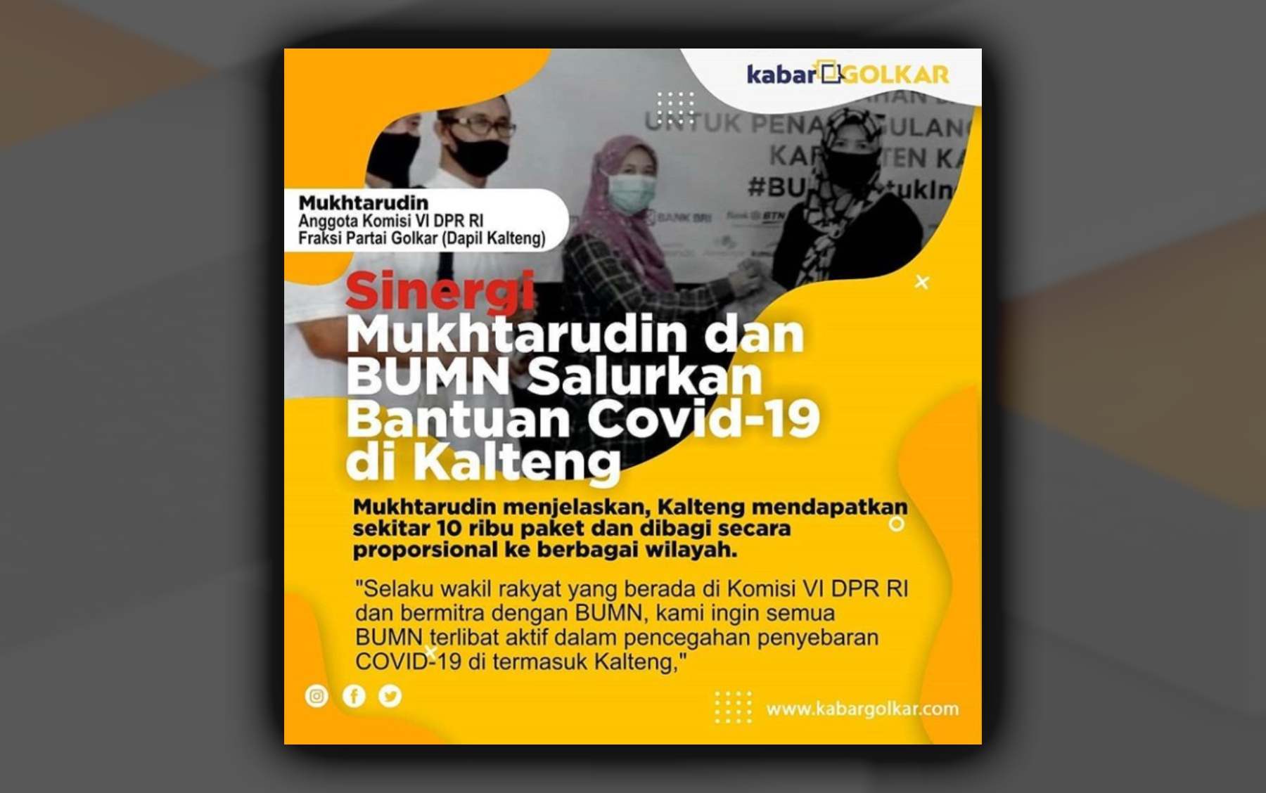 Sementara itu, Anggota DPR RI, Mukhtarudin menjelaskan, Kalteng mendapatkan sekitar 10 ribu paket dan dibagi secara proporsional ke berbagai wilayah. “Selaku wakil rakyat yang berada di Komisi VI DPR RI dan bermitra dengan BUMN, kami ingin semua BUMN terlibat aktif dalam pencegahan penyebaran COVID-19 di Indonesia, termasuk Kalteng,” katanya.