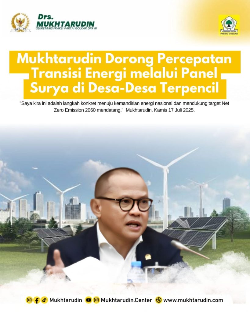 JAKARTA– Anggota Komisi XII DPR RI Mukhtarudin mendorong strategi percepatan transisi energi melalui pemanfaatan panel surya di desa-desa yang belum teraliri listrik sebagai bagian dari dukungan terhadap program Asta Cita pemerintah.